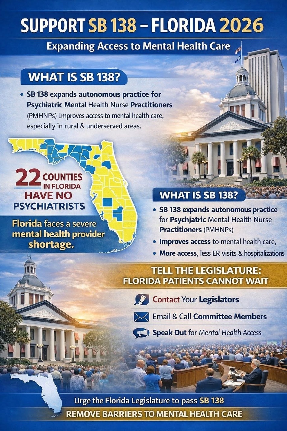 SB 138 expands autonomous practice for Psychiatric Mental Health Nurse Practitioners (PMHNPs) so care can reach patients now, especially in rural and underserved communities.